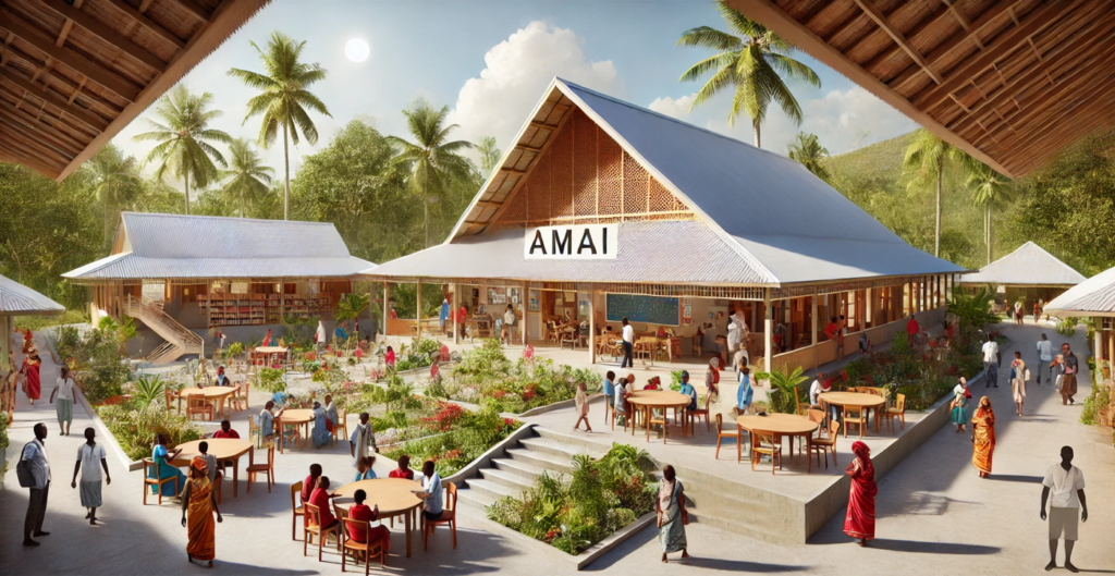 Illustration conceptuelle du futur centre social de l’AMAI à Dembeni. Ce visuel est une représentation imaginaire et ne reflète pas le projet final, qui évoluera en fonction des besoins, des ressources et des contraintes locales. L’objectif est de créer un espace accueillant et fonctionnel, dédié aux activités éducatives, sociales et culturelles pour la communauté.