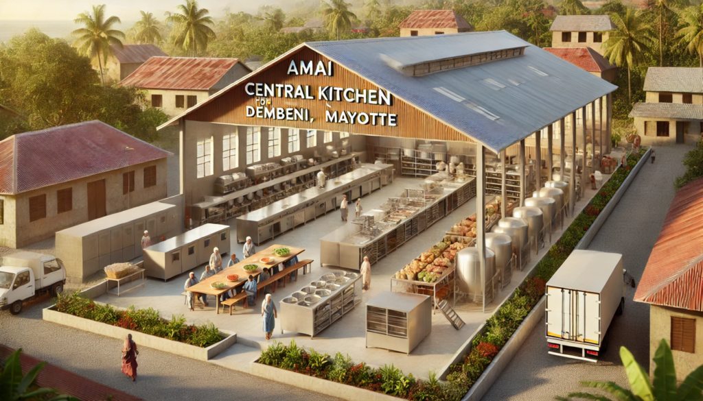 Illustration conceptuelle de la future cuisine centrale de l’AMAI à Dembeni. Ce visuel sert uniquement à donner une idée du projet, mais le résultat final pourra être totalement différent en fonction des contraintes techniques, budgétaires et architecturales. L’objectif reste de créer un espace fonctionnel et adapté à la production de 3 000 repas par jour pour les écoles et autres structures bénéficiaires.